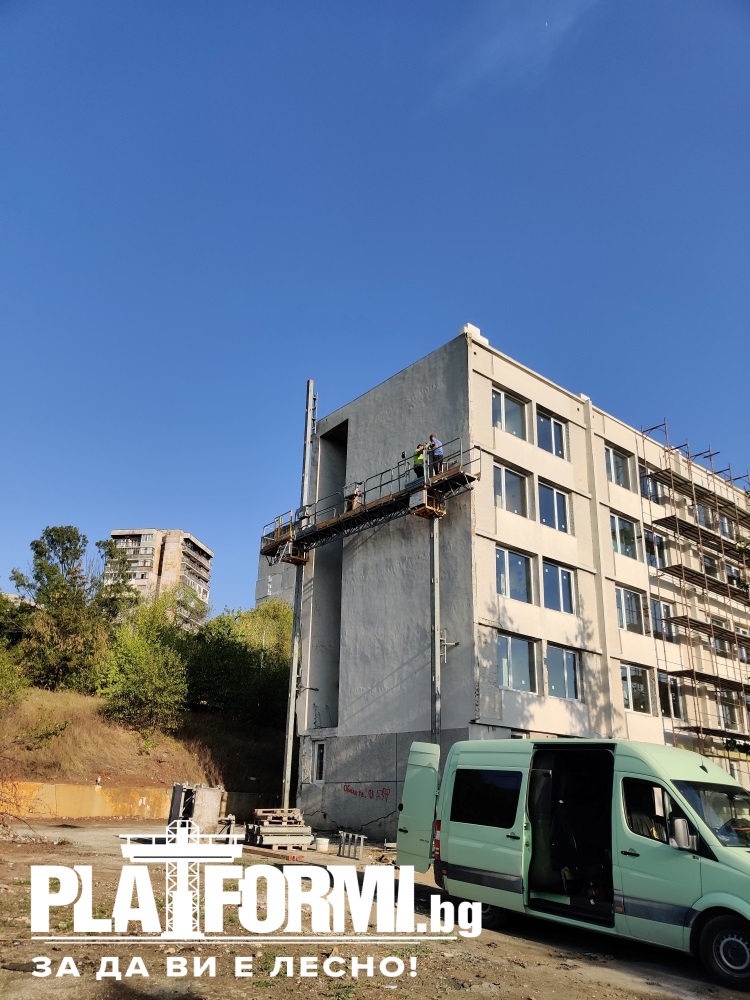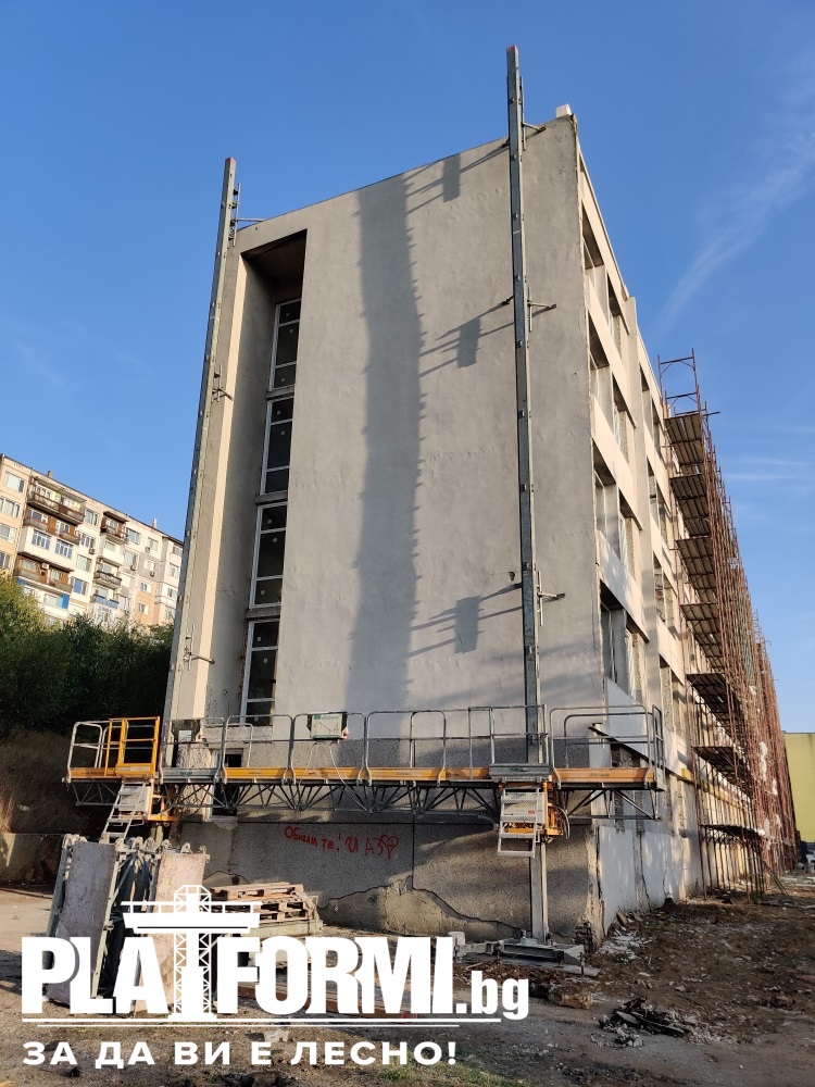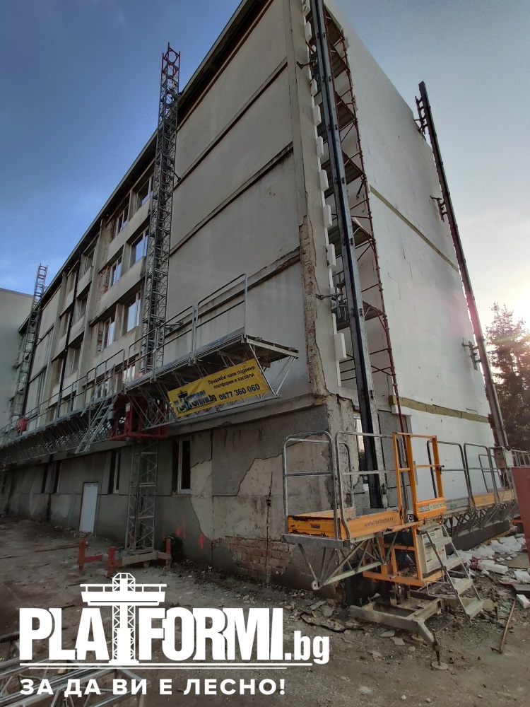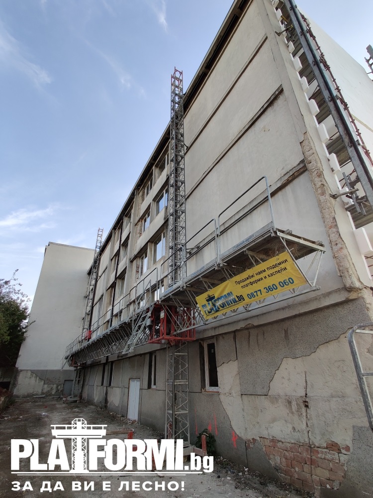 Монтаж подемни платформи за саниране собственост на възложителя. Извършихме монтаж подемни платформи за санирането на обществено административна сграда в комбинация със скеле монтирано от възложителя. Възложителят, изпълнява проект за енергийна ефективност при който комбинира работата на подемните платформи с наличното му скеле. Извършихме монтаж и узаконяване на две двуколонни платформи , собственост на възложителя.