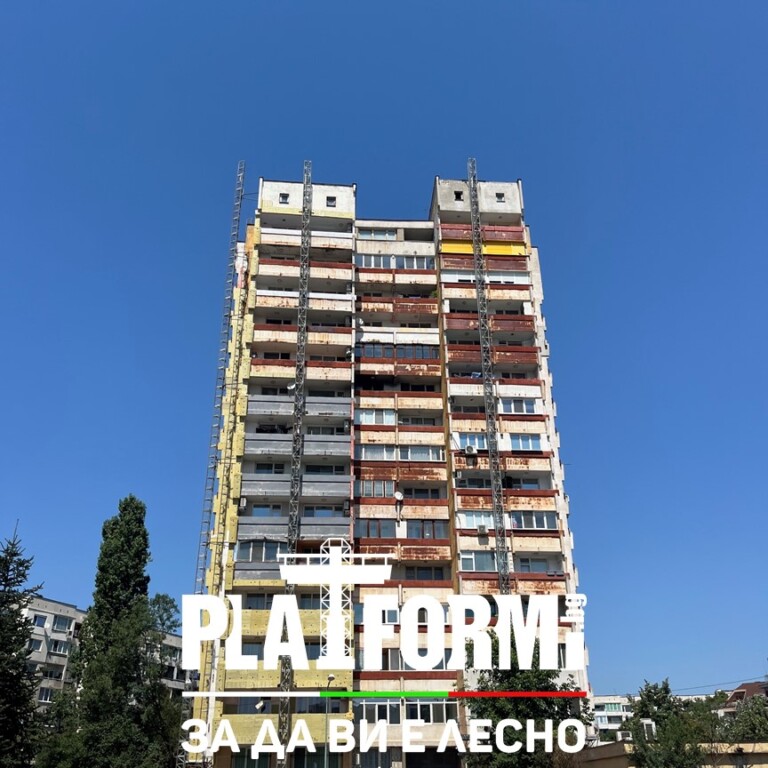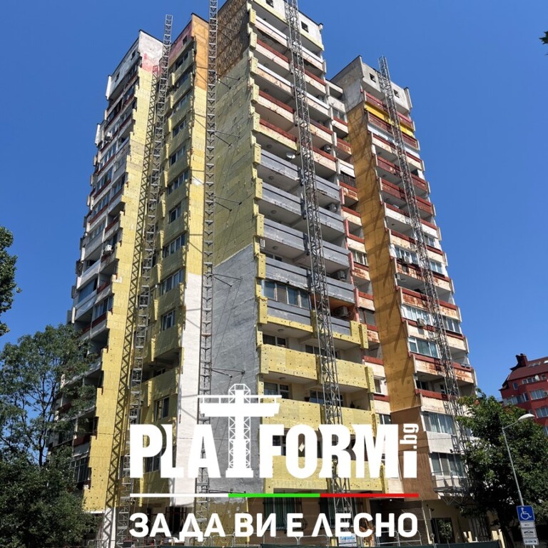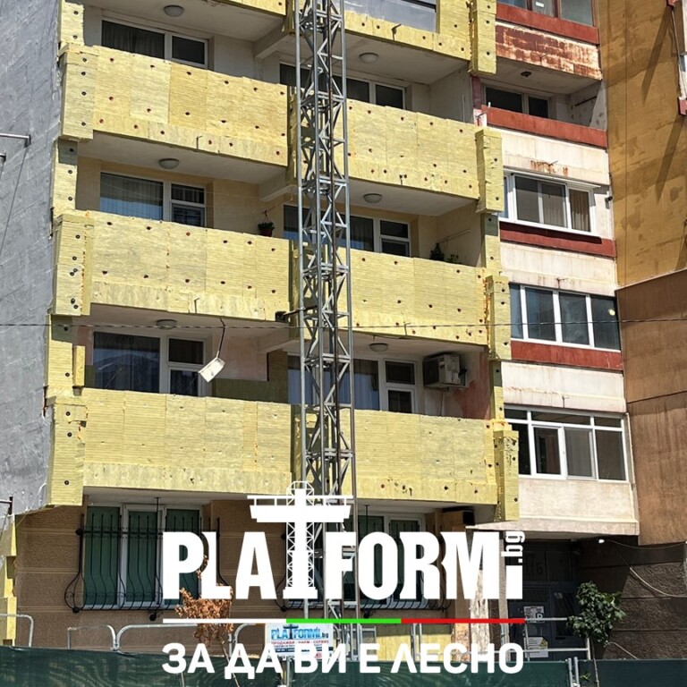 Платформи под наем за саниране на жилищен блок в град София. Самостоятелен жилищен блок с височина 48м, за саниране по НПЕЕМЖС, ще бъде реализиран в рамките на 6 месеца. Доставихме, монтирахме и узаконихме една двуколонна и две едноколонни подемни платформи, спрямо заданието на възложителя. Санирането с подемни платформи един от най-бързите и лесни начин за саниране на съществуващи сгради и изграждане на нови фасади на новостроящи се сгради. Със своите предимства, подемните платформи са предпочитания избор при изграждане или обновяване на фасада.