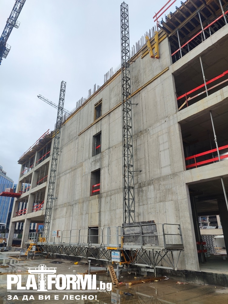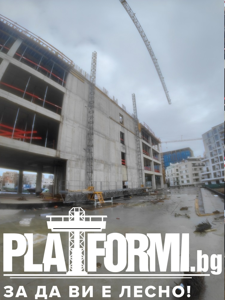 Подемна платформа за монтаж на кофраж. По задание на клиент монтирахме двуколонна подемна платформа обслужваща груб строеж. Двуколонната подемна платформа ще спомогне монтажа на кофражните платна на грубия строеж на сградата. Двуколонната подемна платформа, ще се надгражда последователно с напредването височината на сградата. С използването на двуколонна подемна платформа, възложителя ще скъси времето за изпълнение на грубия строеж. Двуколонните подемни платформи са подходящи за монтаж на окачени фасади, монтаж на кофражни системи, зидане на тухли, саниране на сгради.