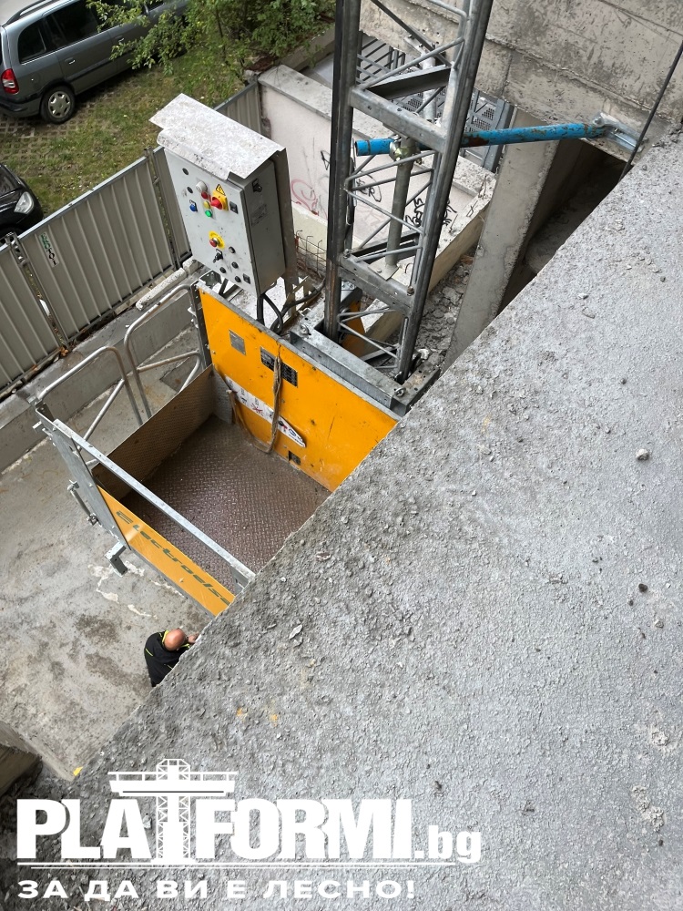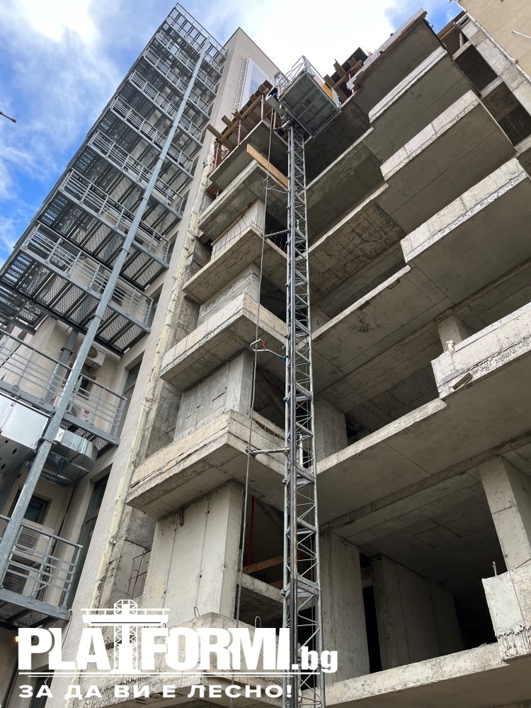 Строителен подемник под наем за груб строеж. На строителен обект в центъра на град София, не е възможен монтаж на кулокран. За покриване дейностите по вертикален транспорт, монтирахме строителен подемник с товароподемност до 1000кг.. С този строителен подемник, строителят, ще обслужва грубия строеж, като превозва кофражната система към следващия етаж. Строителният подемник, ще послужи за превоз на материали и за довършителните СМР дейности. Строителният подемник, ще се надгражда поетапно спрямо растежа на грубия строеж.